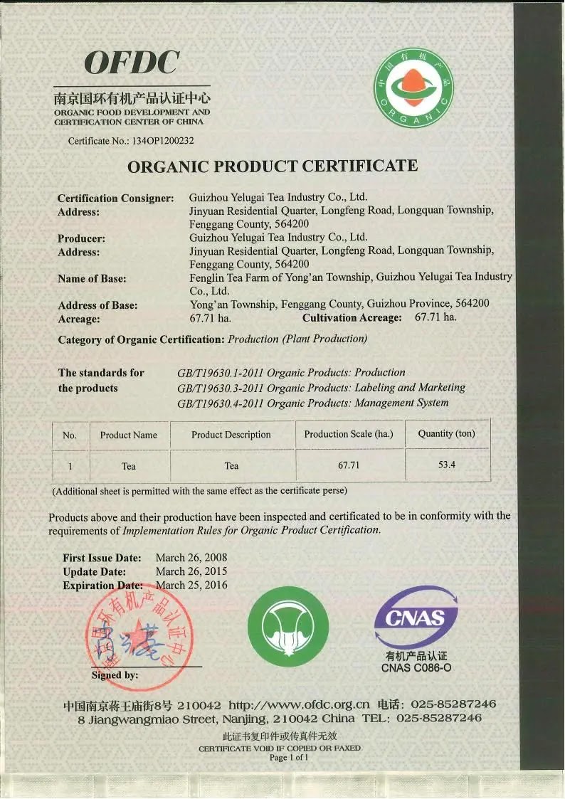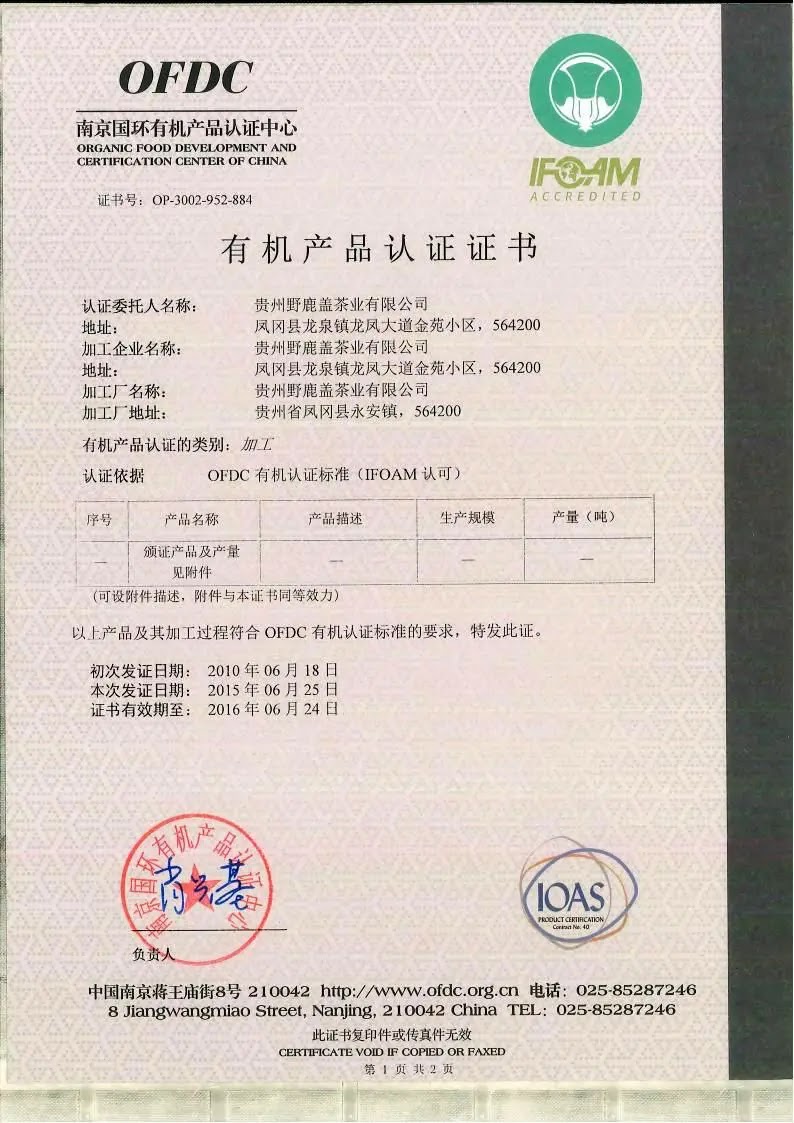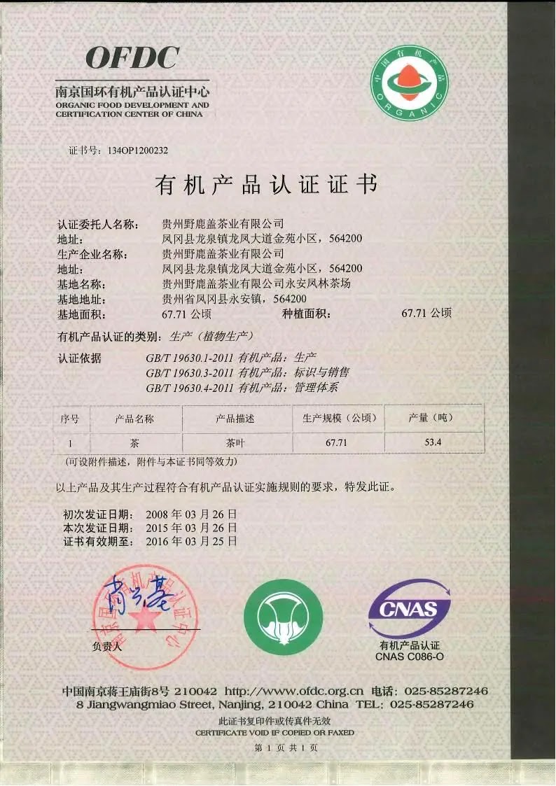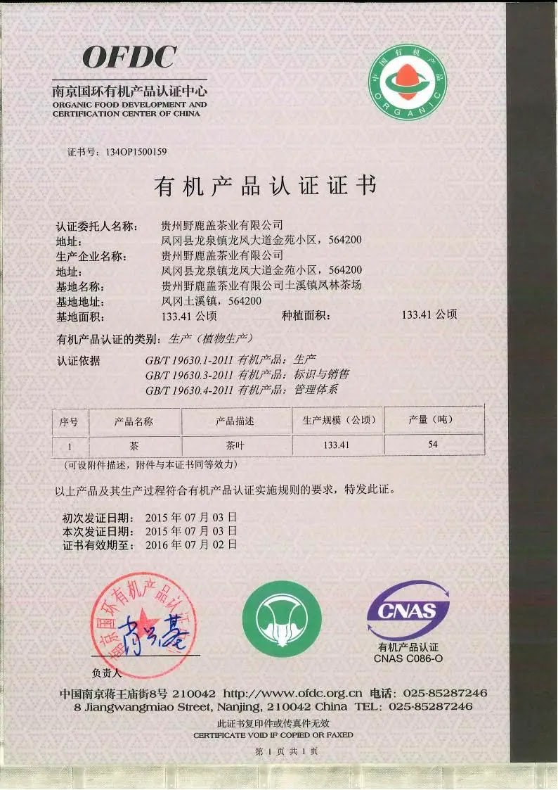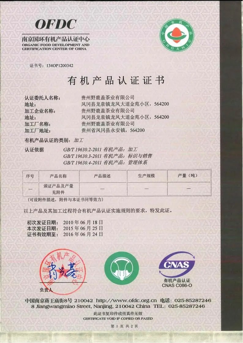 2015年有机产品认证证书