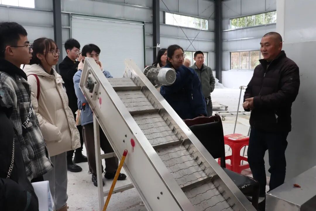 沿着盘山公路,我们来到了野鹿盖茶叶加工厂,书记为我们介绍,由于从前此处多有野鹿出没故而得名"野鹿盖",也足见当地生态环境的优越。随后我们进入了茶厂内部参观。茶厂内部的环境干净敞亮,十分注重卫生管理,副镇长向我们介绍了凤冈茶叶的从采摘、加工到销售的经营模式,以及将产业发展的重点由"量"转移到"质",着力将"双有机"的标准应用于整个产业链的经营理念,打造高品质凤冈茶。在参观结束后,副镇长与书记热情邀请我们前往工厂一旁的职工书屋,亲口品一品野鹿盖的特色红茶与绿茶。捧一杯香茗,伴着四溢的茶香,从与副镇长的交谈中我们了解到,土溪镇大连村的乡村振兴之路单凭茶业是难以实现的,目前土溪镇正致力于乡村振兴的基石——产业振兴,而产业振兴最需要的便是青壮年劳动力,传统茶业对人才的素质要求高,但数量需求却较少,无法吸引青年劳动力返乡就业,所以他们通过对实践经验的不断总结中探寻出了由茶——桑——牛——菌,四个产业所构成的独特的发展道路,而我们今天的参观之路也着重围绕着这几个产业来展开。