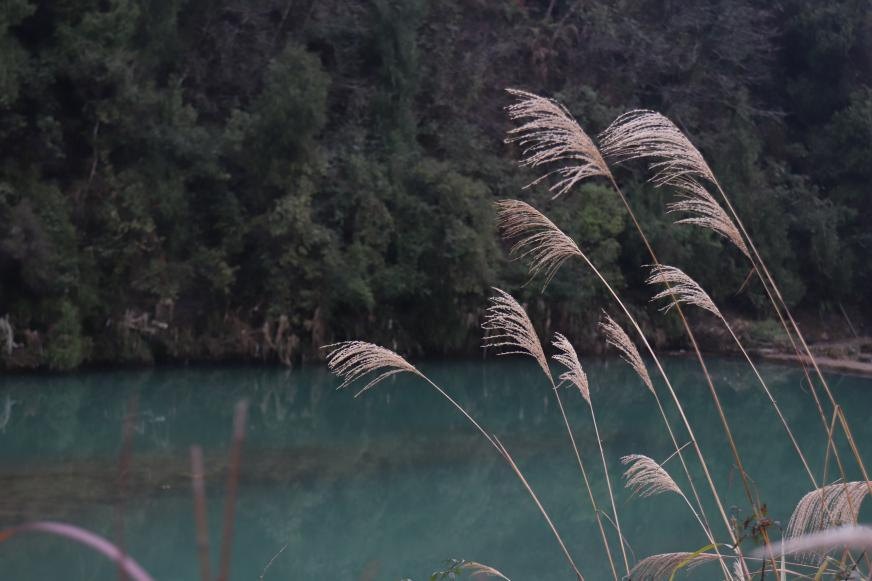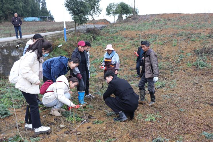 在前往肉牛养殖地前,我们没有选择乘坐交通工具,而是选择了步行的方式,沿着小路,一路前行,书记指着眼前不同于贵州农耕区常见的梯田向我们介绍道,这便是当地开辟的桑树田。为了增加农业用地的同时利用小型机械节省劳动力,大连村的村民选择将从前耕种的梯田改造为平坦的桑树田,并且引进无人机播撒化肥,进一步增提高农业生产效率。而现下正值隆冬时节,桑树的树叶早已脱落,取而代之的是光秃秃的树干,田中正有村民在修剪树枝,我们不禁起了兴致,也到田中体验了一番。